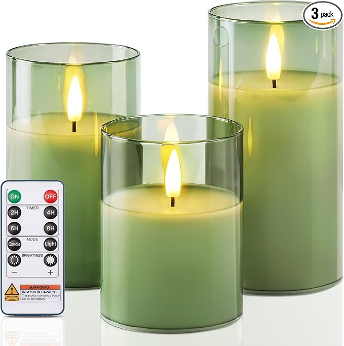 - Package Includes: The flameless candle set includes 3 green LED candles(D3”xH4”5”6”), a remote control and an user manual. Each battery operated candle is powered by 2 AA batteries(not included) that last 500+ hours.
