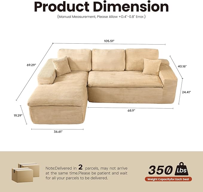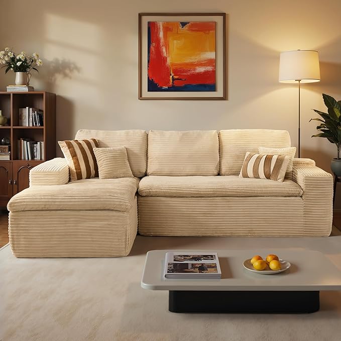 • Corduroy Fabric:Experience the lavish comfort of our enhanced corduroy fabric, offering unmatched softness and warmth. Its impressive durability and stain-fighting prowess keep your sofas looking fresh and lively. With a variety of color choices, our corduroy chaise sofa lets you showcase your unique style while adding irresistible charm to your space