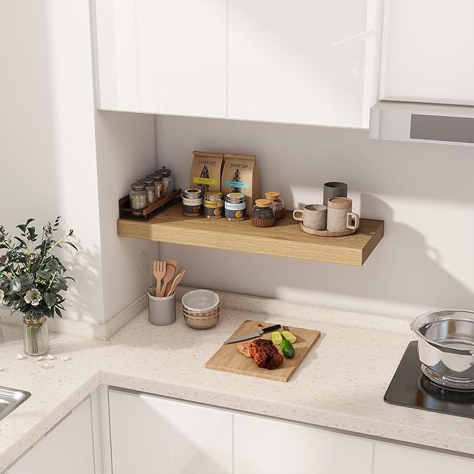 - 【FARMHOUSE RUSTIC WALL SHELF】These floating shelves are made of premium engineered wood board and invisible one-piece bracket. The rustic wooden grain surface add character and warmth to any modern or traditional interior with these thick floating shelves, contrast shelves at staggering heights on the wall or mount side-by-side or in the corner for a clean streamlined look.
