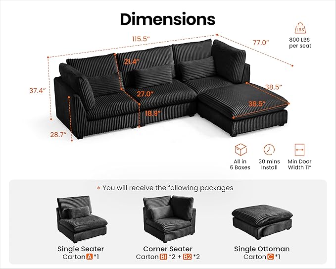 - 【Shipped in multiple Packages for Easy Setup】To enhance your convenience, the sectional will be delivered in multiple packages, allowing for easier handling and assembly. Each package is carefully packed to ensure safety during transit, and while they may arrive at different days, rest assured that our professional customer service is ready to assist you with any concern. The thoughtful design makes the setup process simpler and more efficient,ensuring you enjoy your sectional without any hassle