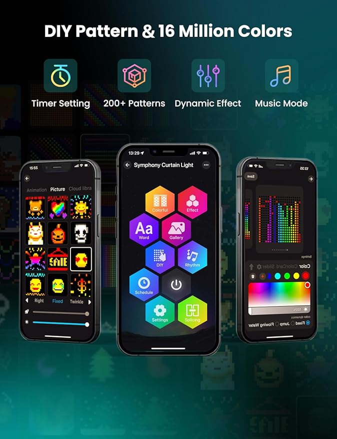 - [RGB+IC Multicolored Lighting]: 6.6 x 6.6ft Smart LED Curtain Light contains 400 lamp beads which ensures a higher pixel density for customizing any patterns, phrases and GIFs, offering 16 millions colors for endless options of color setting and changing, suitable for creating unique and luminous backdrops for home and moment decorations; With group control to link with multiple curtain lights, you can make a larger pattern and more eye-catching displaying effect