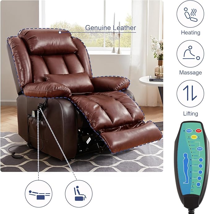 MAEVIS Large Genuine Leather Lift Chairs, Dual Motor Lift Chiars Recliner for Elderly,Extended Footrest and Lumbar Pillow for Tall Man,with Heat and Massage, USB and Type-C Ports(Brown)
