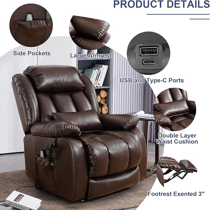 - [Upgraded Size] Our power lift recliner has a longer footrest and thicker backrest with double lumbar cushion design, which can provide you with a more comfortable using experience. In addition, the footrest has been extended by 3", which can more fully support your feet when you recline in the chair to read or rest, allowing you to get a more ultimate experience.