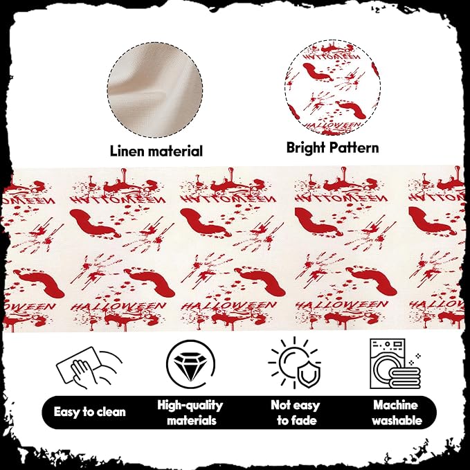 - Package Content: Includes 1 Halloween table runner (13x72 inches) with red bloodstains and footprints printed on it, these classic Halloween elements instantly turn your dining table into the focus of the holiday