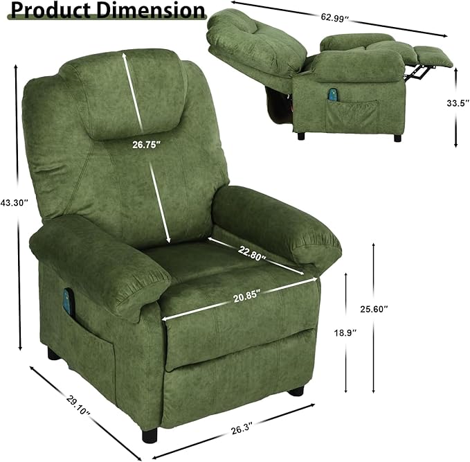 - Massage Recliner Chair : The green recliner chair is adjustable between 90-150 degrees. You can choose to adjust the recliner to the right position to reduce stress and body pain, such as: massage, rest, listen to music, watch TV, sleep or lie down, our recliners are perfectly matched to your different needs