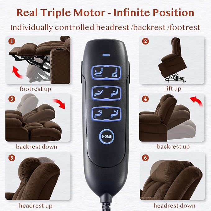 - Real Triple Motor & Infinite Position & 180° Lay Flat: Enjoy power lift recliner chair for elderly, individually controlled headrest /backrest /footrest separately, infinite adjusts 45° to 180° lay flat, designed for those who can't sleep in bed . Whether you're reading, watching TV, napping, sleeping, or standing up, this recliner lift chair meets all your needs