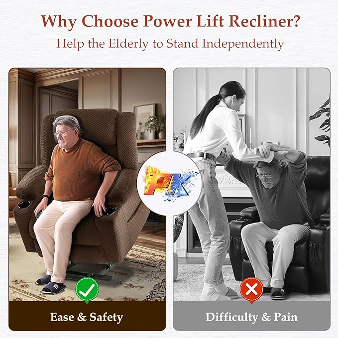 - Power Lift Assist: Our lift chairs is designed for the comfort and well-being of the elderly, disabled, recovering. It lifts to a near-standing position with a smooth and steady motion, reducing strain on muscles and joints. More than just a power lift recliner, it enhances independence