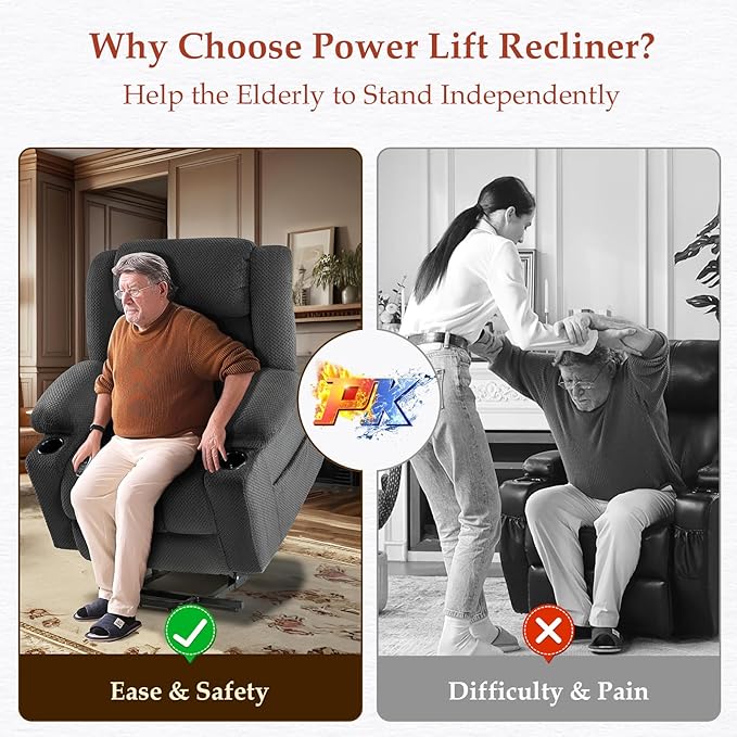 - Power Lift Assist: Our lift chairs is designed for the comfort and well-being of the elderly, disabled, recovering. It lifts to a near-standing position with a smooth and steady motion, reducing strain on muscles and joints. More than just a power lift recliner, it enhances independence