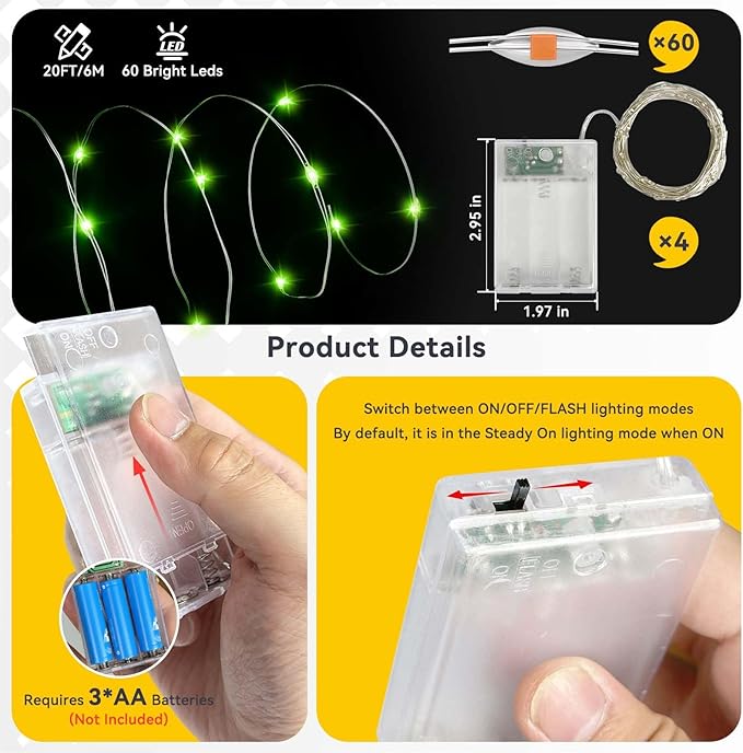 4 Pack 60LED Christmas Fairy Lights Battery Operated - 20FT Twinkle Lights with 2 Lighting Modes Indoor Outdoor, Waterproof Led Fairy String Lights for Bedroom, Classroom, Dorm, DIY Decor, Green