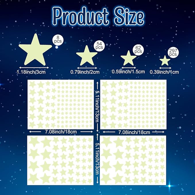 - What You Get: A set of glow in the dark star stickers, you can combine glow stars for ceiling in the dark at will, and create a personalized night sky scene by being creative. Glow in dark stars for ceiling add sparkle and vitality to any room.