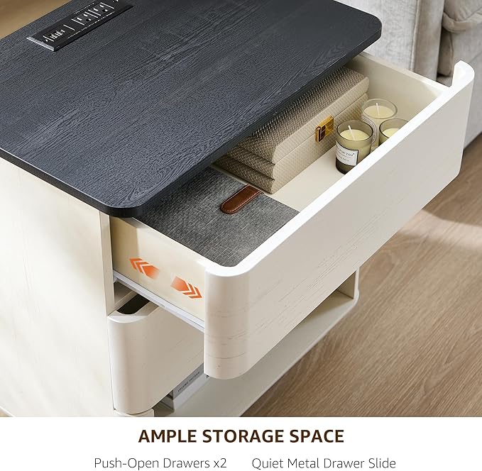 - Spacious & Practical Design – Features a spacious 22" x 15.7" desktop, perfect for holding your laptop, alarm clock, table lamp, and daily essentials. The semi-open cubby offers quick access to remotes, books, and more while keeping your space tidy. Built-in charging station on the tabletop lets you power up your devices with ease.