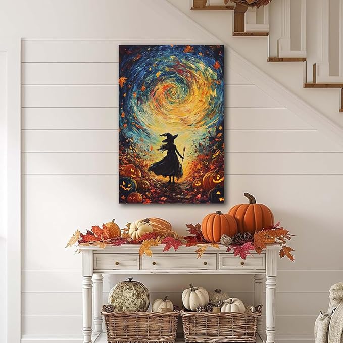Halloween Autumn Witchy Decor Wall Art Prints,Gothic Witch in Whirlwind Autumn with Pumpkins Scene Pictures Poster,Fall Festival Home Decor Painting Canvas Poster for Bedroom Bathroom,24"x36" Unframed