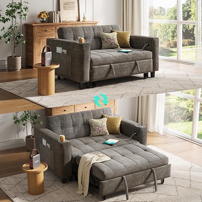 - Convenient Sleeper Couch:This convertible futon bed is thoughtfully designed with a charging station, allowing you to conveniently charge multiple devices through both USB and Type-C ports. The built-in cup holders make it easy to place your drinks, preventing spills. The side storage pocket offers additional space to keep magazines, remote controls, and other small items, adding extra convenience to your everyday life