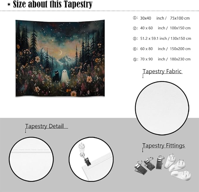 - Easy Installation and Maintenance: Hang it effortlessly using the included 1× Tapestry 3× Barb Clamps and 3× Non-marking Nail Hooks. It's machine washable (without bleach) for easy cleaning and can be ironed at a low temperature