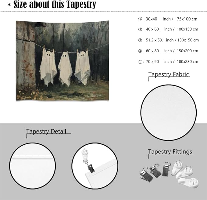 Vintage Halloween Tapestry Funny Ghosts on Clothesline Tapestry Wall Hanging Farmhouse Gothic Room Decor Spooky Ghost Prints for Dark Academia Halloween Party House Decoration Tapestries 40x60inch