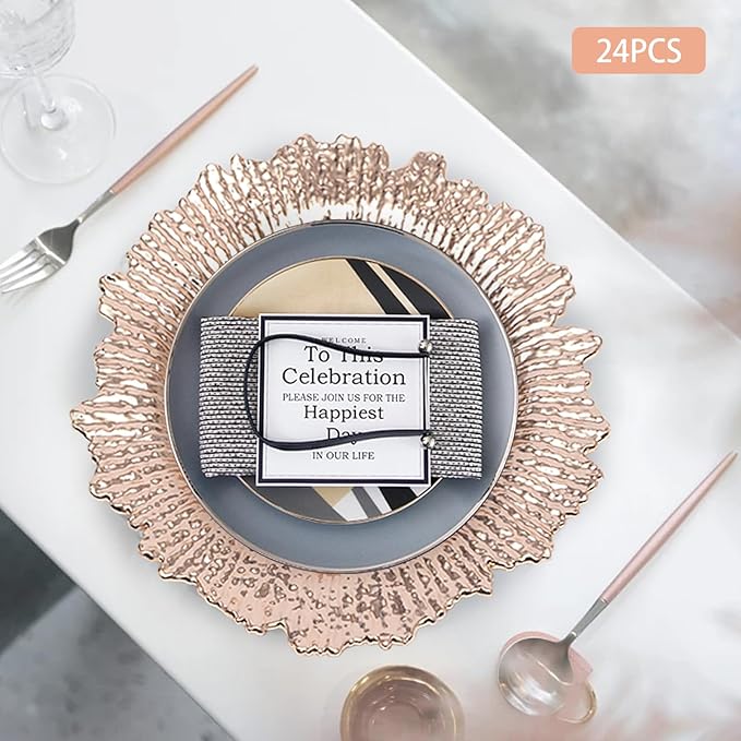 - 【Elegant Charger Plates Set】These plate chargers for table setting are designed in elegant color, classical embossed edge, making them look more noble and classic, which are suitable for weddings, easily attracting the attention of guests.